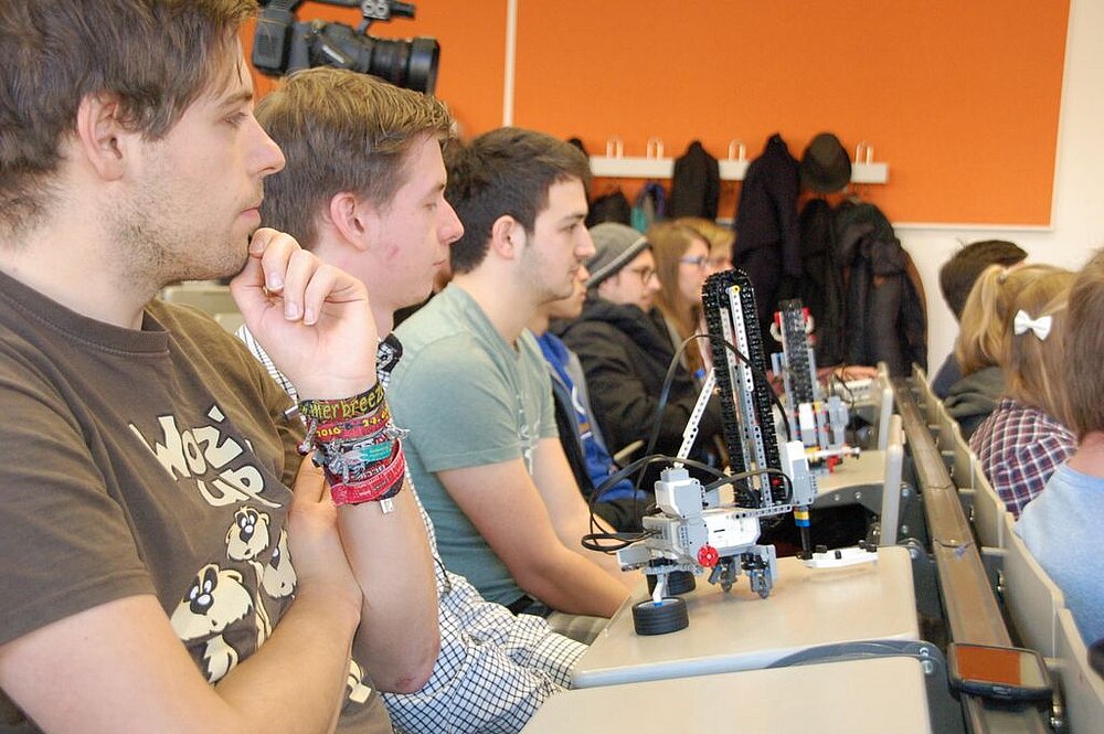 Alle Studentinnen und Studenten haben hervorragende Leistungen gezeigt. Sowohl bei der Programmierung mit einer den Studierenden unbekannten graphischen Entwicklungsumgebung, als auch bei der Konstruktion der Roboter, was normalerweise nicht in das Aufgabenfeld eines Informatikers fällt.